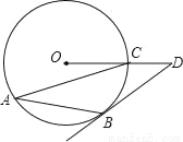 如图,AB、AC是⊙O的两条弦,过点B的切线与OC的延长线交于点D,若∠D=36°,则∠CAB的度数为( )