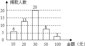 “只要人人都献出一点爱,世界将变成美好的人间”.在今年的慈善一日捐活动中,市某中学八年级三班50名学生自发组织献爱心捐款活动.班长将捐款情况进行了统计,并绘制成了统计图.根据如图提供的信息,捐款金额的众数和中位数分别是( )