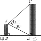 如图,甲楼AB的高度为20米,自甲楼楼顶A处,测得乙楼顶端C处的仰角为45°,测得乙楼底部D处的俯角为30°,则乙楼CD的高度是_____ 米.