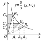 如图所示,点A1,A2,A3在x轴上,且OA1=A1A2=A2A3,分别过点A1,A2,A3作y轴的平行线,与反比例函数(x>0)的图象分别交于点B1,B2,B3,分别过点B1,B2,B3作x轴的平行线,分别于y轴交于点C1,C2,C3,连接OB1,OB2,OB3,那么图中阴影部分的面积之和为 .