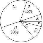 2)扇形统计图中,求E等级对应扇形的圆心角α的度数;