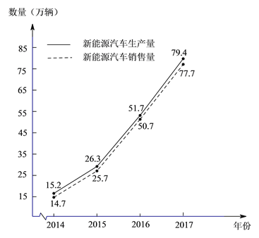 近年来,随着新能源汽车推广力度加大,产业快速发展,越来越多的消费者开始接受并购买新能源汽车,我国新能源汽车的生产量和销售量都大幅增长,下图是2014-2017年新能源汽车生产和销售的情况:根据统计图中提供的信息,预估全国2018年新能源汽车销售量约为__________万量,你的预估理由是____________________.