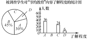 我省教育厅下发了《在全省中小学幼儿园广泛深入开展节约教育》的通知,通知中要求各学校全面持续开展“光盘行动”.某市教育局督导检查组为了调查学生对“节约教育”内容的了解程度(程度分为:“A—了解很多”,“B—了解较多”,“C—了解较少”,“D—不了解”),对本市一所中学的学生进行了抽样调查,我们将这次调查的结果绘制成以下两幅统计图.