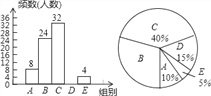 (1)表中的n= ,扇形统计图中B组对应的圆心角为 °;