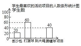 我市某中学决定在学生中开展丢沙包、打篮球、跳大绳和踢毽球四种项目的活动,为了解学生对四种项目的喜欢情况,随机调查了该校m名学生最喜欢的一种项目(每名学生必选且只能选择四种活动项目的一种),并将调查结果绘制成如下的不完整的统计图表: