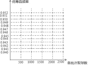 (1)请在图中完成这批彩色弹力球“优等品”频率的折线统计图
