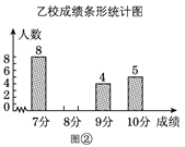 甲、乙两校派相同人数的优秀学生,参加县教育局举办的中小学生美文诵读决赛。比赛结束后,发现学生成绩分别是7分、8分、9分或10分(满分10分),核分员依据统计数据绘制了如下尚不完整的统计图表。根据这些材料,请你回答下列问题: