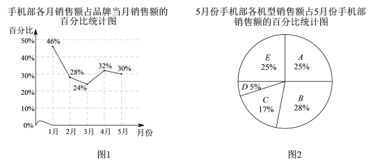 ()该品牌手机部有A、B、C、D、E五个机型,图2表示在5月份手机部各机型销售额占5月份手机部销售额的百分比情况统计图.则5月份 机型的销售额最高,销售额最高的机型占5月份该品牌销售额的百分比是 .![]()