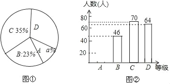 (2)图①中,a等于多少?D等级所占的圆心角为多少度?