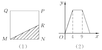 如图(1),在矩形MNPQ中,动点R从点N出发,沿N→P→Q→M方向运动至点M处停止.设点R运动的路程为x,ΔMNR的面积为y,若y关于x的函数图象如图(2)所示,则当x=9时,点R应运动到____.