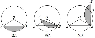 如图1、图2,在圆O中,OA=1,AB=,将弦AB与弧AB所围成的弓形(包括边界的阴影部分)绕点B顺时针旋转α度(0≤α≤360),点A的对应点是A′.