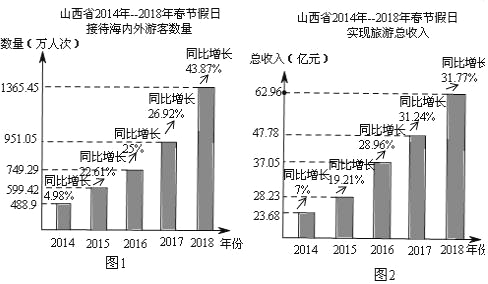 (1)如图1所示,山西近五年春节假日接待海内外游客的数量逐年增加,2018年首次突破了“千万”大关,达到 万人次,比2017年春节假日增加 万人次.