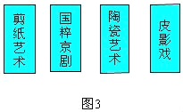 (4)春节期间,小明在“青龙古镇第一届新春庙会”上购买了A,B,C,D四枚书签(除图案外完全相同).正面分别印有“剪纸艺术”、“国粹京剧”、“陶瓷艺术”、“皮影戏”的图案(如图3),他将书签背面朝上放在桌面上,从中随机挑选两枚送给好朋友,求送给好朋友的两枚书签中恰好有“剪纸艺术”的概率.