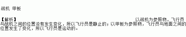 战机 甲板 【解析】以战机为参照物,飞行员与战机之间的位置没有发生变化,所以飞行员是静止的;以甲板为参照物,飞行员与地面之间的位置发生了变化,所以飞行员是运动的。