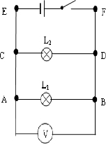 分别把电压表接在AB、CD和EF两点上,分别测量L1、L2和电路两端的总电压,测量并联电路电压图如下: