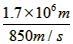 解:在15℃空气中的声速v声=340m/s v=2.5v声=2.5×340 m/s=850 m/s。 s=1700km=l.7×106m,由v