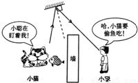 如图所示,小聪通过一平面镜看到小猫要偷吃小鱼.图中画出了入射光线和反射光线,但未标出光的传播方向.请你在图中用箭头标出小聪看到小猫偷鱼吃时的光的传播方向,并根据光的反射规律画出平面镜.