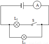 解答:解:由实物图可知,电流从电源的正极流出,先进入电流表,再分为两股,一股经开关S流经灯泡L2,另一股经灯泡L1与L2流出的电流汇合,最后回到电源的负极,如图所示: