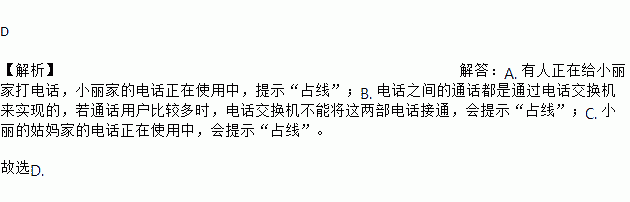 D 【解析】解答:A. 有人正在给小丽家打电话,小丽家的电话正在使用中,提示“占线”;B. 电话之间的通话都是通过电话交换机来实现的,若通话用户比较多时,电话交换机不能将这两部电话接通,会提示“占线”;C. 小丽的姑妈家的电话正在使用中,会提示“占线”。 故选D.