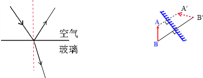 分别画出图中的通过玻璃的折射光线和反射光线,在图中画出物体AB在平面镜中所成的像
