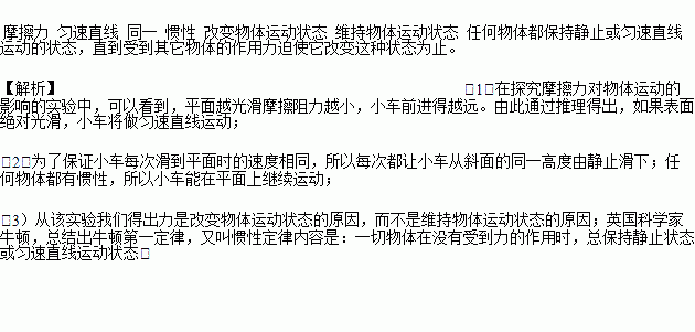(1)在探究摩擦力对物体运动的影响的实验中,可以看到,平面越光滑__________越小,小车前进得越远。由此通过推理得出,如果表面绝对光滑,小车将做______________运动;
