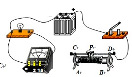 在图所示电路中,有一根导线尚未连接,请以笔画线代替导线补上,要求:当滑动变阻器滑片P向左移动时,电压表示数变小。