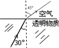解:由入射角为30°,折射角与入射角两者相差15°,因为光从某种透明的物体射入空气,折射角大于入射角,所以可得折射角为30°+15°=45°,如下图所示: