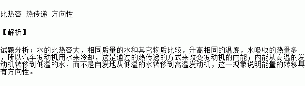 Æû³µÔÚÐÐʻʱ£¬·¢¶¯»úµÄζȻáÉýµÃºÜ¸ß£®ÎªÁËÈ·±£°²È«£¬¿ÉÓÃˮѻ·½øÐÐÀäÈ´£¬ÓÃË®À´ÀäÈ´ÊÇÒòΪˮµÄ ½Ï´ó£¬ÕâÊÇͨ¹ý µÄ·½Ê½À´¸Ä±ä·¢¶¯»úµÄÄÚÄÜ£®ÄÚÄÜ´Ó¸ßÎµķ¢¶¯»ú×ªÒÆµ½µÍεÄË®£¬¶ø²»ÊÇ×Ô·¢µØ´ÓµÍεÄË®×ªÒÆµ½¸ßη¢¶¯»ú£¬ÕâÒ»ÏÖÏó˵Ã÷ÄÜÁ¿µÄ×ªÒÆ¾ßÓÐ £®