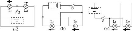 的电流方向,在虚线方框内画出电池组正确接入电路的符号,并在图上画出另一盏电灯L
