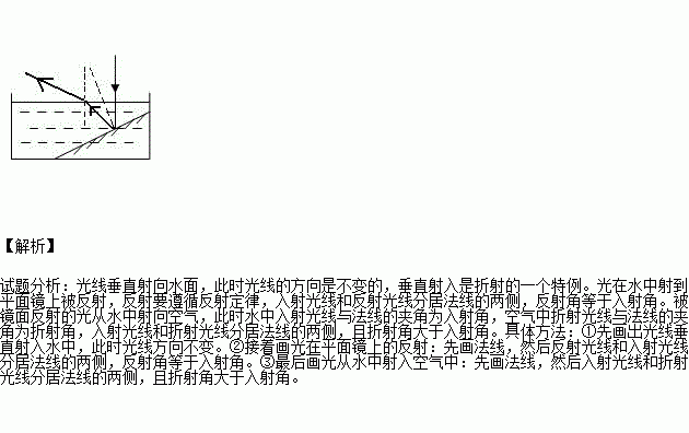 将一平面镜斜放在装有水的水槽中,有一束光线垂直射向水面,如上面右图所示,请画出这束光线在水中行进最后射出水面的光路图。