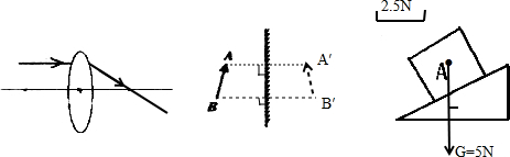画出经过凸透镜折射后的光线、线段在平面镜中所成的像以及重为5N的物体A所受重力的图示.