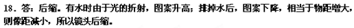 小刚用已经调节好的照相机将位于充满水的水池底部一个美丽的图案拍摄下来。当把水排掉后,小刚仍然想在原来的位置用此照相机拍到这个图案清晰的照片,他应该使镜头前伸还是后缩?说明理由