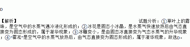 D 【解析】试题分析:①草叶上的露珠,是空气中的水蒸气遇冷液化形成的;②冰花是固态小冰晶,是水蒸气快速放热后由气态直接变为固态形成的,属于凝华现象;③冰雕变小,是由固态冰直接变为气态水蒸气的升华现象;④“雾凇”是空气中的水蒸气放热后,由气态直接变为固态形成的,属于凝华现象,故选D。