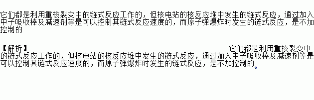 它们都是利用重核裂变中的链式反应工作的,但核电站的核反应堆中发生的链式反应,通过加入中子吸收棒及减速剂等是可以控制其链式反应速度的,而原子弹爆炸时发生的链式反应,是不加控制的 【解析】它们都是利用重核裂变中的链式反应工作的,但核电站的核反应堆中发生的链式反应,通过加入中子吸收棒及减速剂等是可以控制其链式反应速度的,而原子弹爆炸时发生的链式反应,是不加控制的。