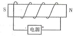分析:由电磁铁的磁极利用右手螺旋定则可判断电流方向,则可知电源的正负极.