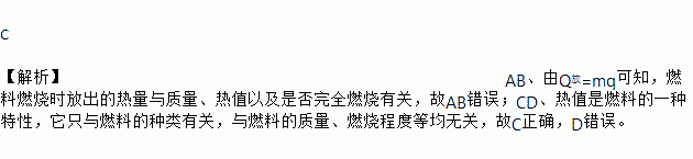 C 【解析】AB、由Q放=mq可知,燃料燃烧时放出的热量与质量、热值以及是否完全燃烧有关,故AB错误;CD、热值是燃料的一种特性,它只与燃料的种类有关,与燃料的质量、燃烧程度等均无关,故C正确,D错误。