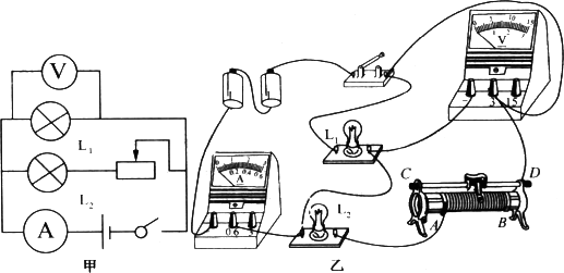 在图中,要求L1、L2并联,用电流表测量干路中的电流(约为0.4 A),电压表测量灯泡L1的电压,变阻器调节L2的亮度,开关控制整个电路,将符合要求的电路图画在虚线框内,并用笔画线表示导线将图中各个元件连接起来.