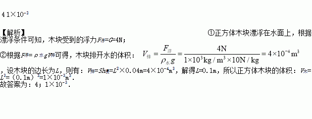 如图所示,一正方体木块漂浮在水面上,木块重4N,下表面距水面4cm,则木块受到的浮力为____N,木块的体积是____m3。