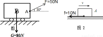 (1)如图1所示,B小车的重力为80N,受到与水平方向成30度角斜向上右方大小为50N的拉力,请画出该拉力和重力示意图.(2)如图2所示,一物体在水平面上向右运动,水平面对它的摩擦力大小为10N,试用力的示意图表示出此摩擦力的三个要素.