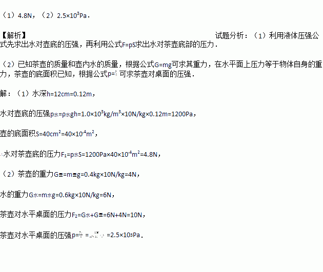 如图所示,平底茶壶的质量是400g,底面积是40cm2,内盛0.6kg的开水,放置在面积为1m2的水平桌面中央.试求: