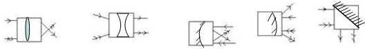 在下列5个方框内填入合适的透镜和面镜