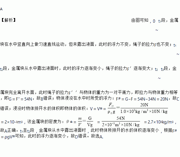 A ¡¾½âÎö¡¿ÓÉͼ¿ÉÖª£¬0?t1¶Î£¬½ðÊô¿éÔÚË®ÖÐÊúÖ±ÏòÉÏ×öÔÈËÙÖ±ÏßÔ˶¯£¬µ«Î´Â¶³öÒºÃæ£¬´ËʱµÄ¸¡Á¦²»±ä£¬Éþ×ÓµÄÀÁ¦FÒ²²»±ä£»t1?t2¶Î£¬½ðÊô¿é´ÓË®Öж³öÒºÃæÊ±£¬´ËʱµÄ¸¡Á¦Öð½¥±äС£¬Éþ×ÓµÄÀÁ¦F¡äÖð½¥±ä´ó£»t2?t3¶Î£¬½ðÊô¿éÍêÈ«Àë¿ªË®Ãæ£¬´ËʱÉþ×ÓµÄÀÁ¦F¡ä¡äÓëÎïÌåµÄÖØÁ¦ÎªÒ»¶ÔƽºâÁ¦£¬¼´ÀÁ¦ÓëÎïÌåÖØÁ¦ÏàµÈ£¬¼´G£½F¡ä¡ä£½54N£¬¹ÊB´íÎó£»ÎïÌå½þûÔÚË®ÖÐʱËùÊܵĸ¡Á¦£ºF¸¡£½G?F£½54N?34N£½...