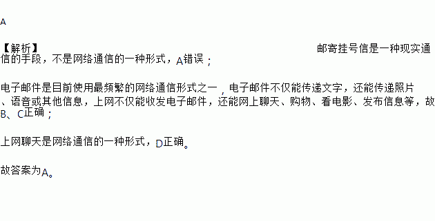 A 【解析】邮寄挂号信是一种现实通信的手段,不是网络通信的一种形式,A错误; 电子邮件是目前使用最频繁的网络通信形式之一,电子邮件不仅能传递文字,还能传递照片、语音或其他信息,上网不仅能收发电子邮件,还能网上聊天、购物、看电影、发布信息等,故B、C正确; 上网聊天是网络通信的一种形式,D正确。 故答案为A。
