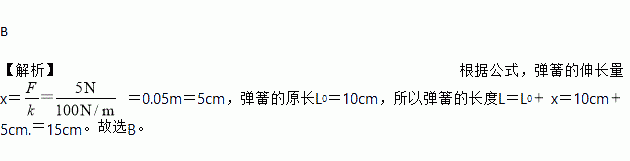 B 【解析】根据公式,弹簧的伸长量x= =0.05m=5cm,弹簧的原长L0=10cm,所以弹簧的长度L=L0x=10cm5cm.=15cm。故选B。