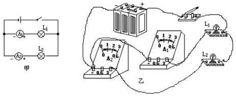 在下图中请你以笔代线将根据甲图中的电路图连接好电路.(其中A