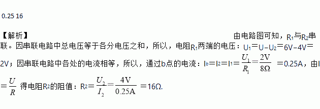 如图所示,电源电压恒为6 V,R1的阻值为8 Ω,R2两端的电压为4 V,则通过b点的电流为________A,R2的阻值为________Ω。