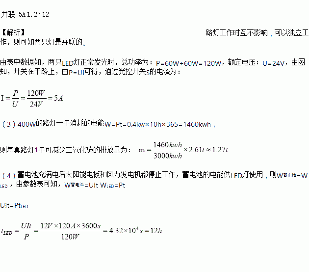 (4)假如蓄电池充满电后太阳能电板和风力发电机都停止工作,则消耗蓄电池一半的电能(设蓄电池对外供电时其电压不变)可使2只LED灯正常发光____________h。