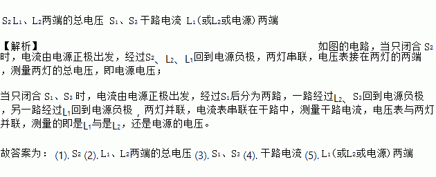 如图所示,要使L1和L2串联,应只闭合开关________,电压表测的是_____________________ ;要使L1和L2并联,应闭合开关________,电流表测的是________ ,电压表测的是___________________的电压。