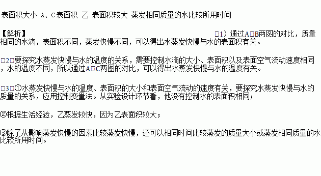 (3)小凡同学猜想水蒸发快慢还可能与水的质量有关,于是进行了如下探究:在相同环境下的两块相同的玻璃板上分别滴上一滴和两滴水(如图)。结果发现甲图中水先蒸发完,于是他得出结论:水蒸发快慢与水的质量有关,水的质量越小蒸发越快。从实验设计环节看,他没有控制水的___________ (选填“质量”或“表面积”)相同;你认为哪个图中的水蒸发速度快?答:____________,理由是_________________________________。除了从影响蒸发快慢的因素比较蒸发快慢,换个角度比较蒸发快慢的做法是相同时间比较蒸发的质量大小或__________________________________________________________________。