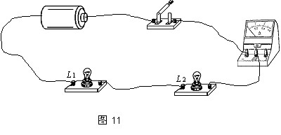 (2)小李同学测量某电路中小灯泡L2的电流时,所连的实物图如图11所示,请检查图11的连线是否有错,若有错,请在有错的连线上打“╳”,并在图中画出正确的连线,注意连线不要